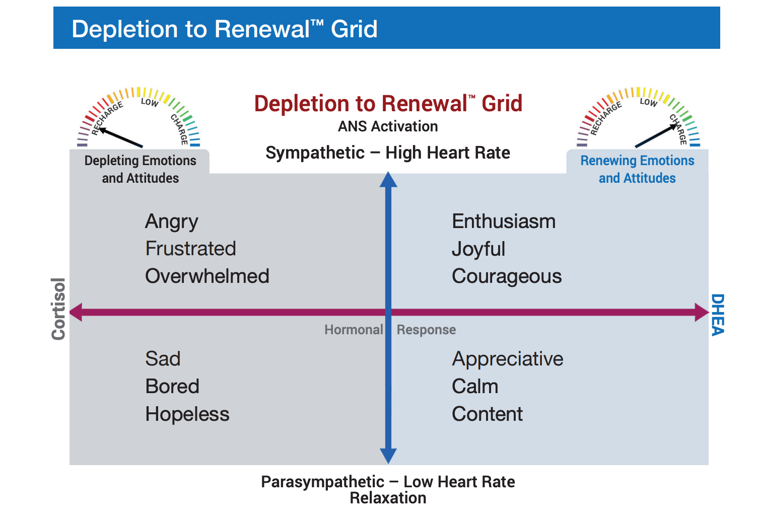 One of the most practical tools for daily self-awareness is the HeartMath Emotional Grid. This simple chart maps emotions along two axes—renewing vs. depleting and high vs. low energy.
